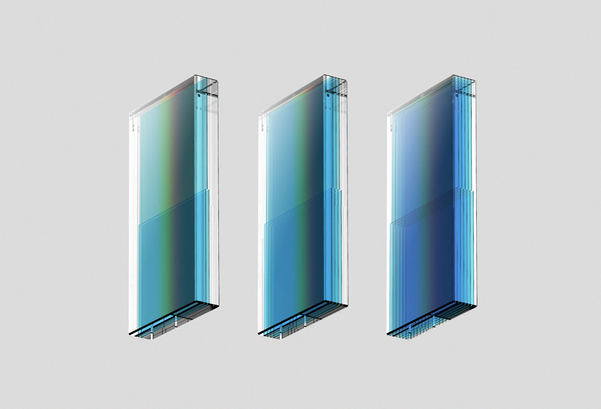 Layered with colors. Half transparent layers laminated in glass blocks creates different densities of the color blue.